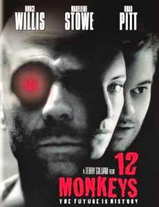 Sinopsis Twelve Monkeys (12 Monkeys)(1995): en “Twelve Monkeys (12 Monkeys)”, corre el año 2035 en el futuro. Una epidemia causada por un virus criminal ha hecho sucumbir a millones de personas, quienes sobrevivieron habitan en comunidades bajo tierra, estériles y muy frías. El recluta James Cole se ofrece como voluntario para ir hacia el pasado y rastrear una muestra del virus, gracias a la cual los hombres de ciencia podrán elaborar una vacuna. En el transcurso del viaje hallará a una hermosa psiquiatra y a Jeffrey Goines (Brad Pitt), un extraño alienado mental hijo de un dueño de laboratotios. Cole tratará de encontrar al”Ejército de los 12 Monos”, un grupo radical vinculado al virus mortal de la enfermedad.
